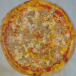 Med tomat, ost, Kødsauce, skinke, ananas, paprika og hvidløg