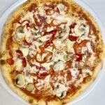 Med tomat, ost, Skinke, champignon, paprika, hvidløg og chili