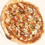 Med tomat, ost, Kødstrimler, fetaost, paprika, hvidløg og chili