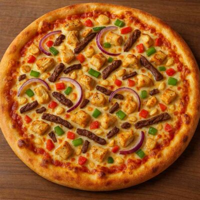 Tomat, ost,  ½ kylling, ½ kodstrimler, log,