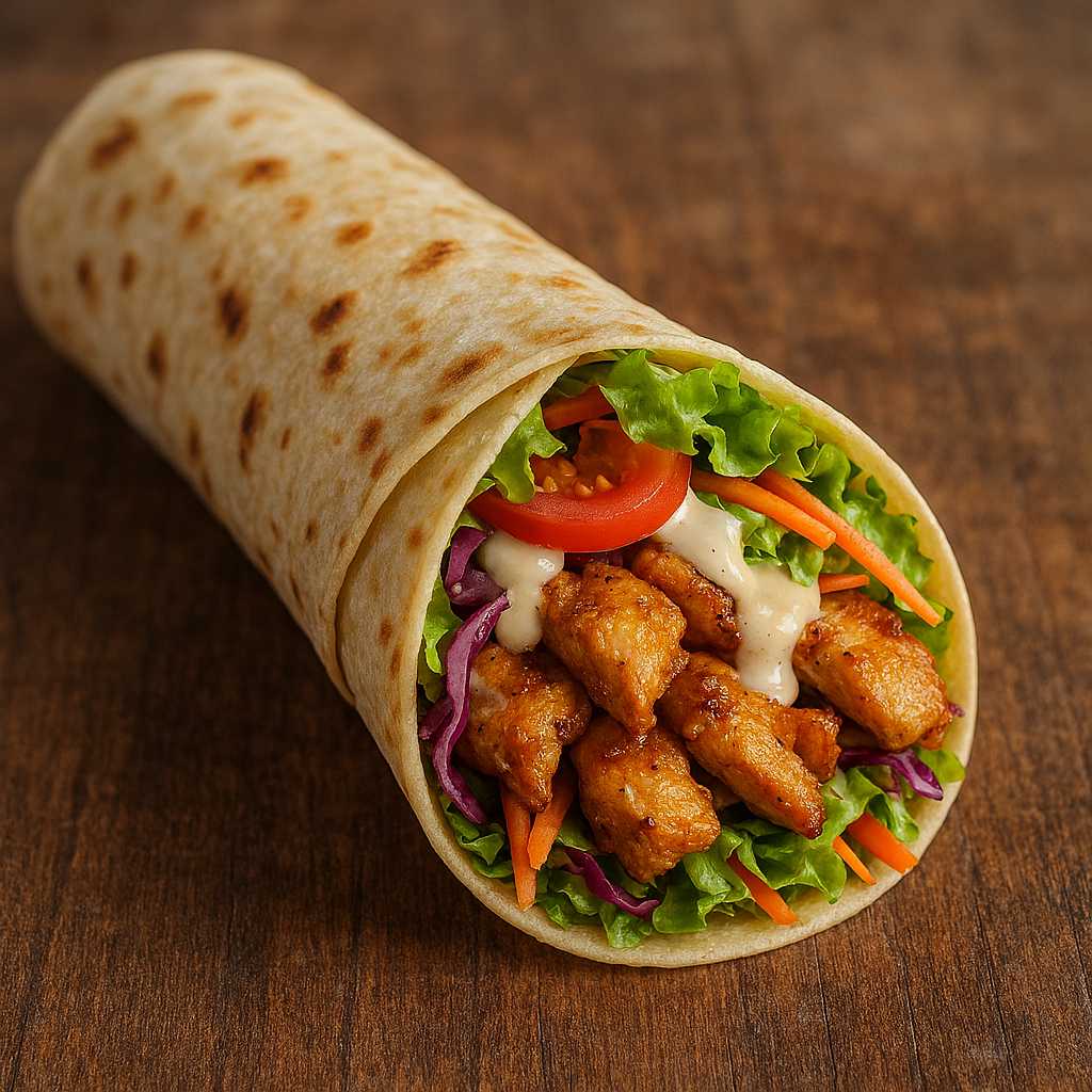 Med Shawarm,Kylling, Skinke, Falfal, Rejer, æg eller tun tomat, ost, salat og dressing