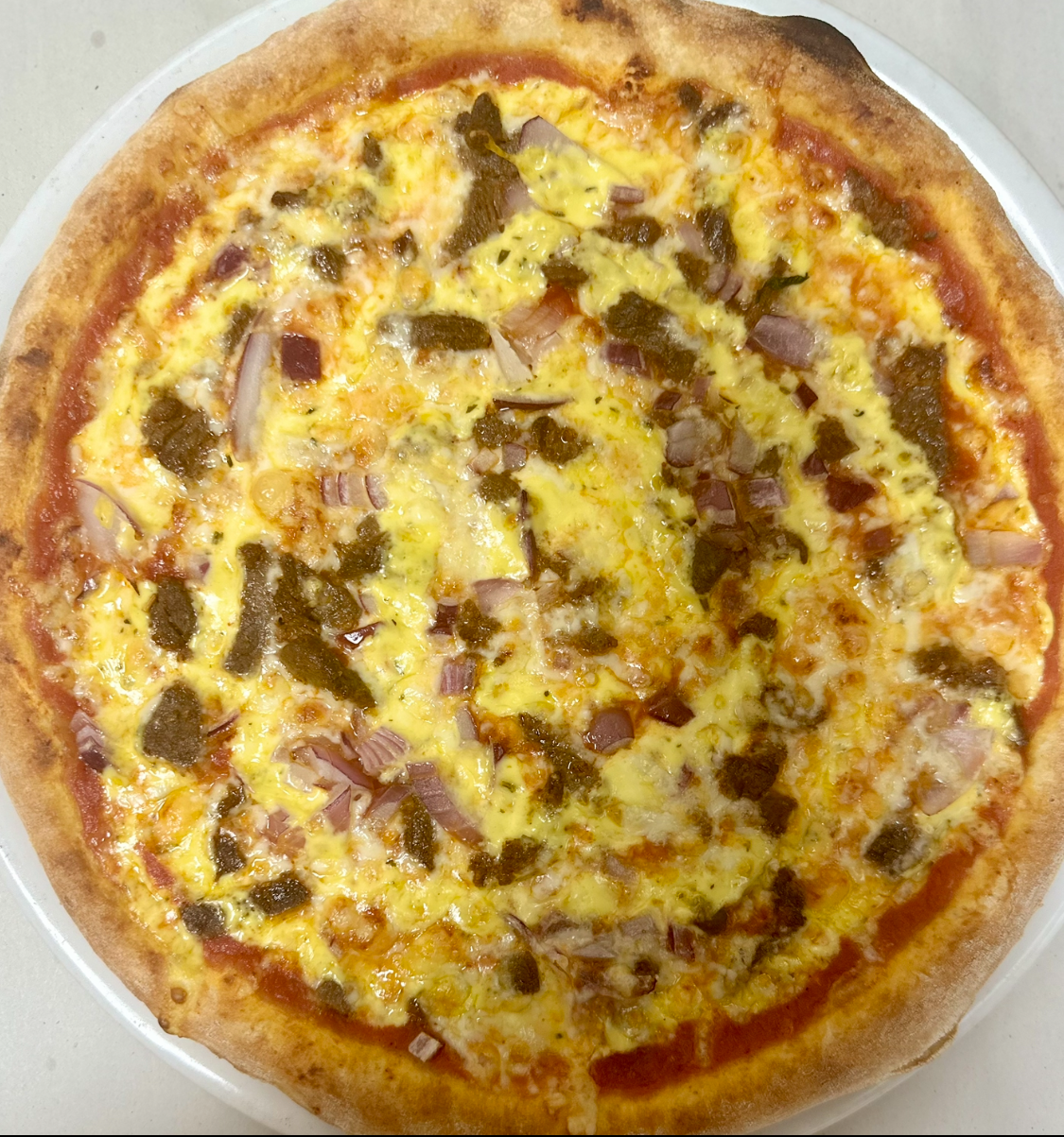 Med tomat, ost, Kødstrimler, løg og bearnaisesauce