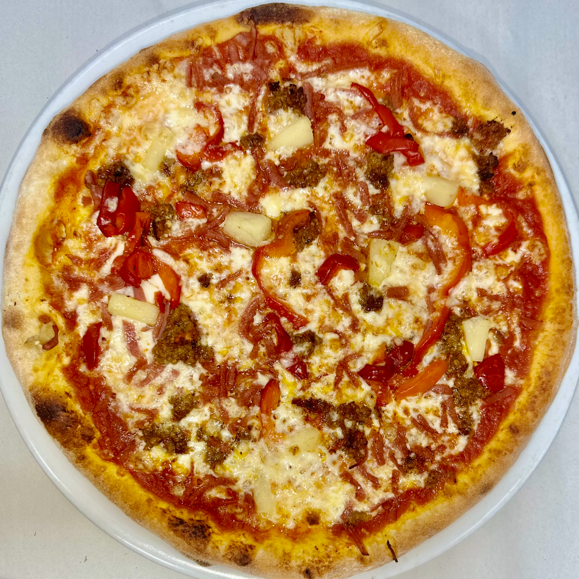 Med tomat, ost, Kødsauce, skinke, ananas, paprika og hvidløg