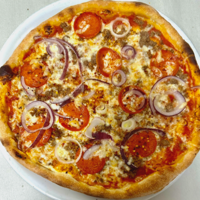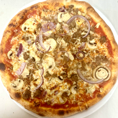Med tomat, ost, Skinke, kødstrimler, champignon og løg