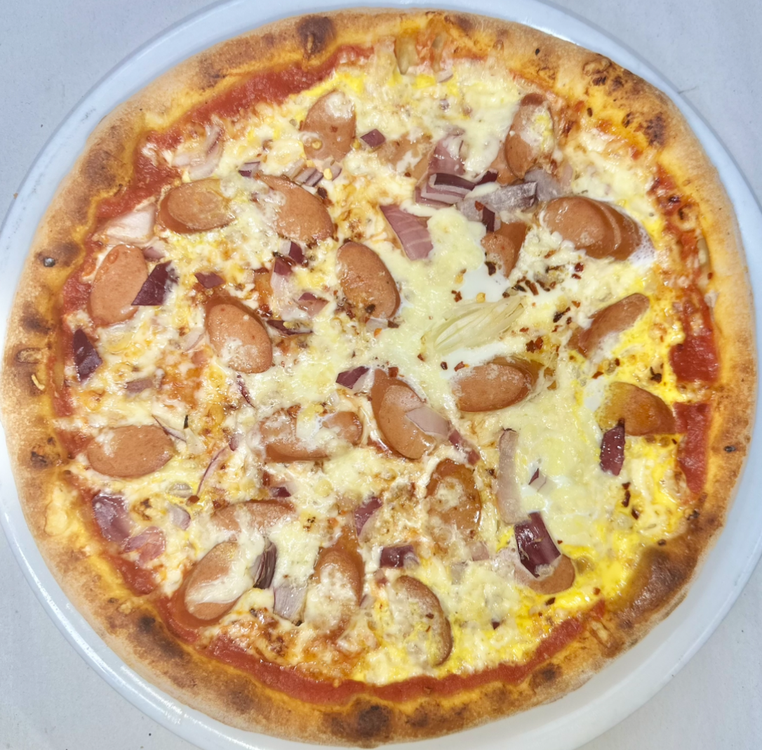 Med tomat, ost, Pølser, æg, løg, chili og hvidløg