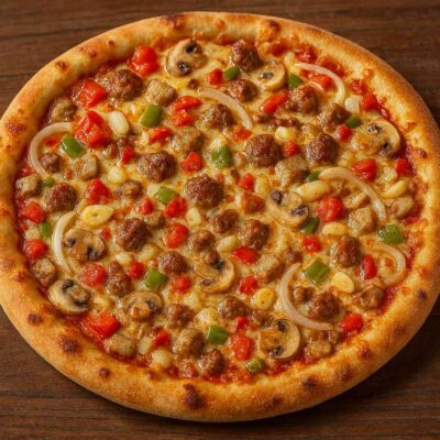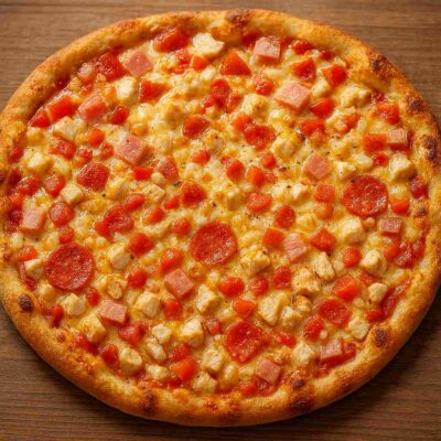 Med tomat, ost, Kødstrimler, løg, champignon og