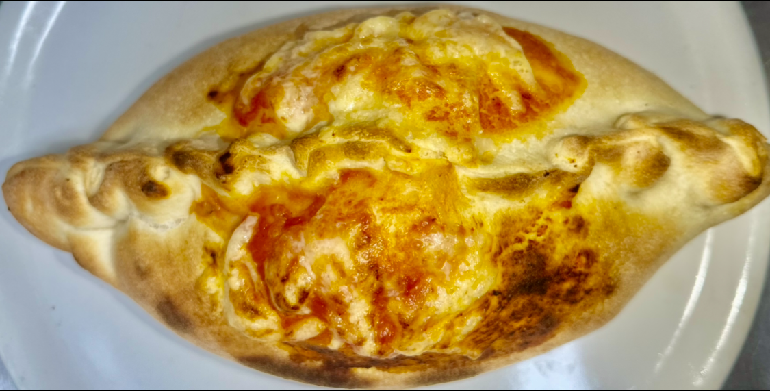 Med tomat, ost, skinke, paprika og hvidløg