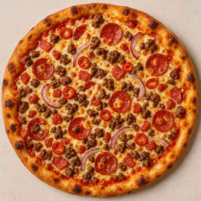 Med shawarma, løg, champignon, paprika og ris eller pommed